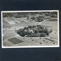 Flygfoto över Lycke kyrka med omgivande åkrar Förlag AB Flygtrafik 1950tal?