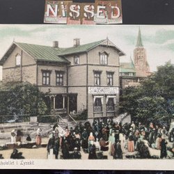 Lysekil folkliv utanför stadshotellet Handkolorerat