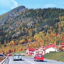 Funäsdalen med fina bilar och Gulf bensinstation. A6