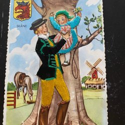 vykort med sydd dräkt från Skåne 1960-talet