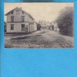 SKILLINGARYD. Stationsgatan med affär med stor reklamskylt ca 1906 (Vaggeryd)