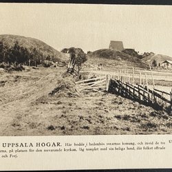 - Gammaldags vykort som avbildar Gamla Uppsala, där historiska gravhögar reser sig stolt.