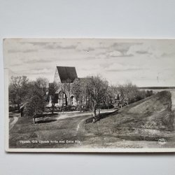 Vykort Uppsala. Gamla Uppsala kyrka med Odins Hög