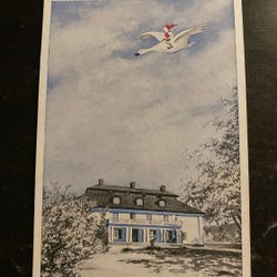 Tecknat Selma Lagerlöfs Mårbacka med flygande gås . signerat A Palm