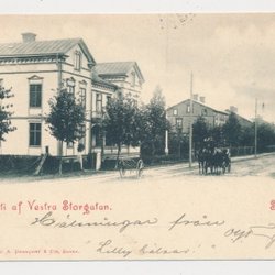 Skara Västra Storgatan Häst o vagn med ridande kusk pg 1901 KV7 8 MIKROhörnveck