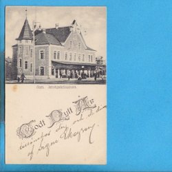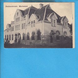 MARIESTAD järnvägsstation i närbild från gatusidan 1910