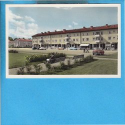 MARIESTAD Hertig Karls torg m affärshus m konsum, bilar, kolorerat foto 1950-tal