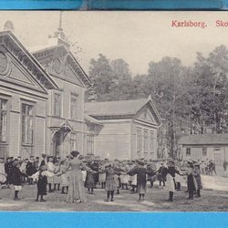 KARLSBORG. Skolhuset med barn och lärarinna i ringar 1908