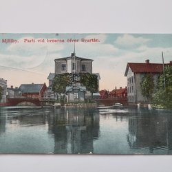 Vykort Mjölby. Parti vid broarna öfver Svartån, 1912