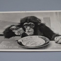 Chimpansen Sussi spisar middag Furuviks park postgånget 1955