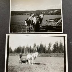 2 st fotografi på arbete med häst på lantbruk och i skogen