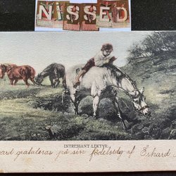 3 lite gammalmodigt tecknade Jul/Nyårskort med häst-motiv 1905-1910tal