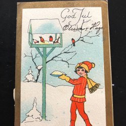 Litet vykort Pojke matar fåglar Osignerat