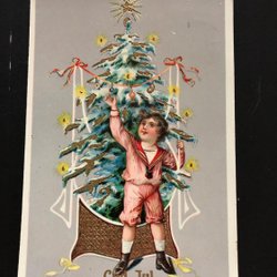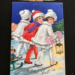 Litet vykort Barn dansar runt gran relief Osignerat