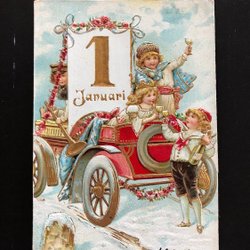 Vackert Gott nytt år vykort med bil och barn i Guld och Relief