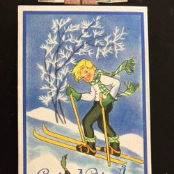 Litet vykort Osignerat pojke på skidor