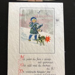 Litet vykort signerat Evans barn med hund