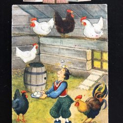 Litet vykort Tupp och barn som målar ägg Osignerat