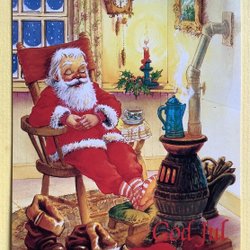 Julkort Tomte och Katt myser vid kaminen