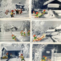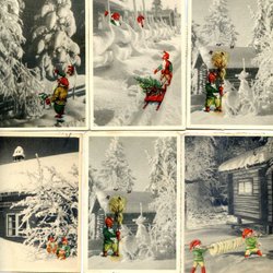 6 småformatiga Semotopografiska Jul/Nyårskort Tecknade färgtomtar/svartvitt foto