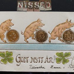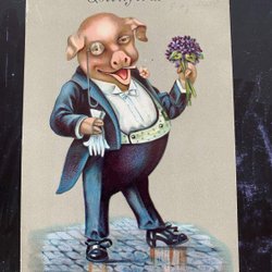Välklädd Gris med lila blommor frankerat Tågarp 1910