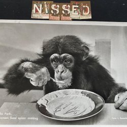 Reklamvykort från Furuviks park Chimpansen Sussi spisar gröt
