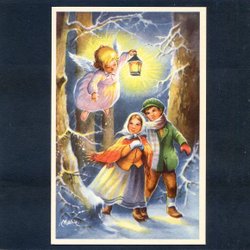 Ängel vakar över barn i skogen Charmigt tecknat Nyårskort sign MARIE 1950tal