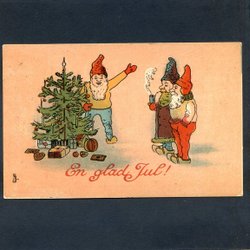 Tre tomtar vid julgran tecknat kort skickat 1907 sign K. Schumacher