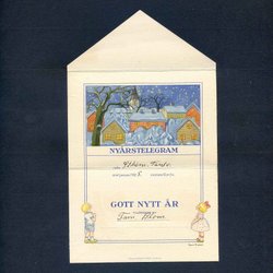 Snöig stad Småformatigt utvikbart Nyårstelegram signerat STINA BROOME 1925