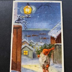 Litet vykort Tomte med julgran signerat Stina Broome