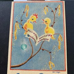 Litet vykort kycklingar sjunger på videgren signerat Brit Cege