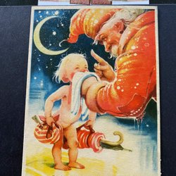 Litet vykort Tomte snyter bäbis signerat Artelius