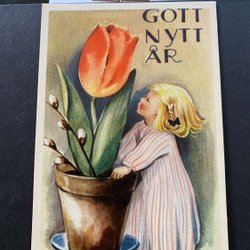 Litet vykort Flicka med tulpan signerat K Frykstrand