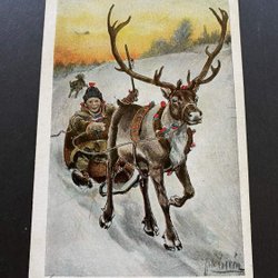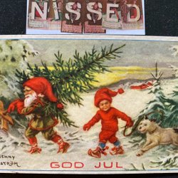 Litet vykort. Tomte pojke med hund . signerat Jenny Nyström