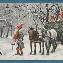Tomtar lackar julklappar Härligt teckn. kort sign TR-n Thorvald Rasmussen ca1905