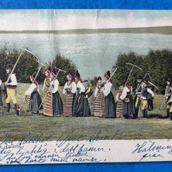 Rättvik Dalkarlar och kullor med lie Brefkort tidigt 1900 tal