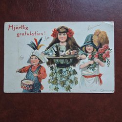 Barn och kvinnor med blomster. Äldre vykort 2 st