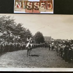 Äkta fotografivykort , . Damen på häst ryggen håller i ett spjut , Tornerspel