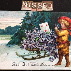 Barn och kälke med lila blommor relief hand textat Julmärke