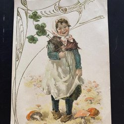 Flicka med fyrklöver och svampar i guld och relief