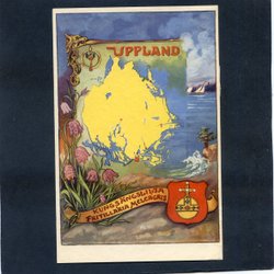 Uppland Dekorativt tecknat heraldiskt kort med karta o landskapsblomma 1950tal