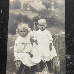 Äkta fotografivykort 2 barn i korgstol Någonstans i Sverige