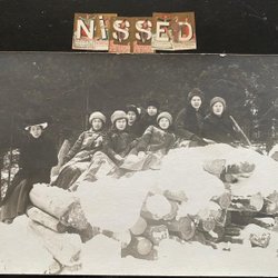 Äkta fotografivykort folksamling på timmervälta med snö Någonstans i Sverige