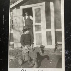 Äkta fotografivykort pojke rider på trähäst