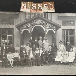 Äkta fotografivykort folksamling framför hus med snickarglä Någonstans i Sverige
