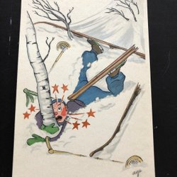 Litet vykort signerat Emil Åberg 4 tomtar kanar på isen