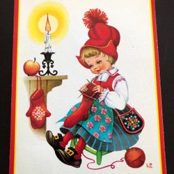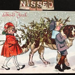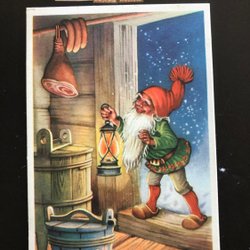 Litet vykort LC Lars Carlsson Tomte hämtar julmat