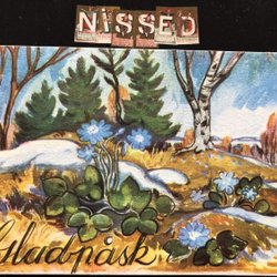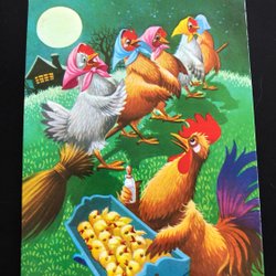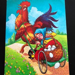 Litet vykort LC Lars Carlsson Höna plockar påskliljor