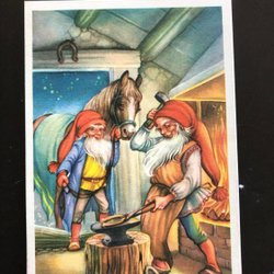 Litet vykort LC Lars Carlsson Tomtar smider hästskor