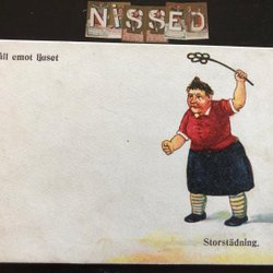 Litet vykort Tomte och gris signerat Jenny Nyström
